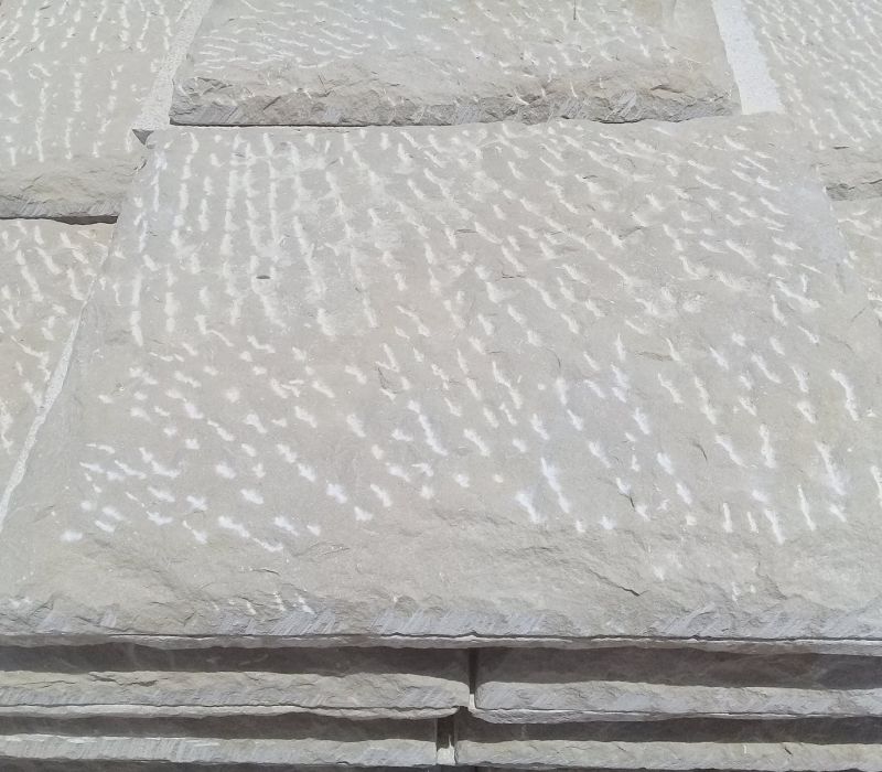 Craftsmen chisel the face of each piece for an exceptionally rustic look which can only be achieved by hand work. These hand worked pieces come in ‘full block’ style for stacking and mortaring or thin veneer style, with a bush hammer back to give ‘teeth’ to grab the adhesive behind it.